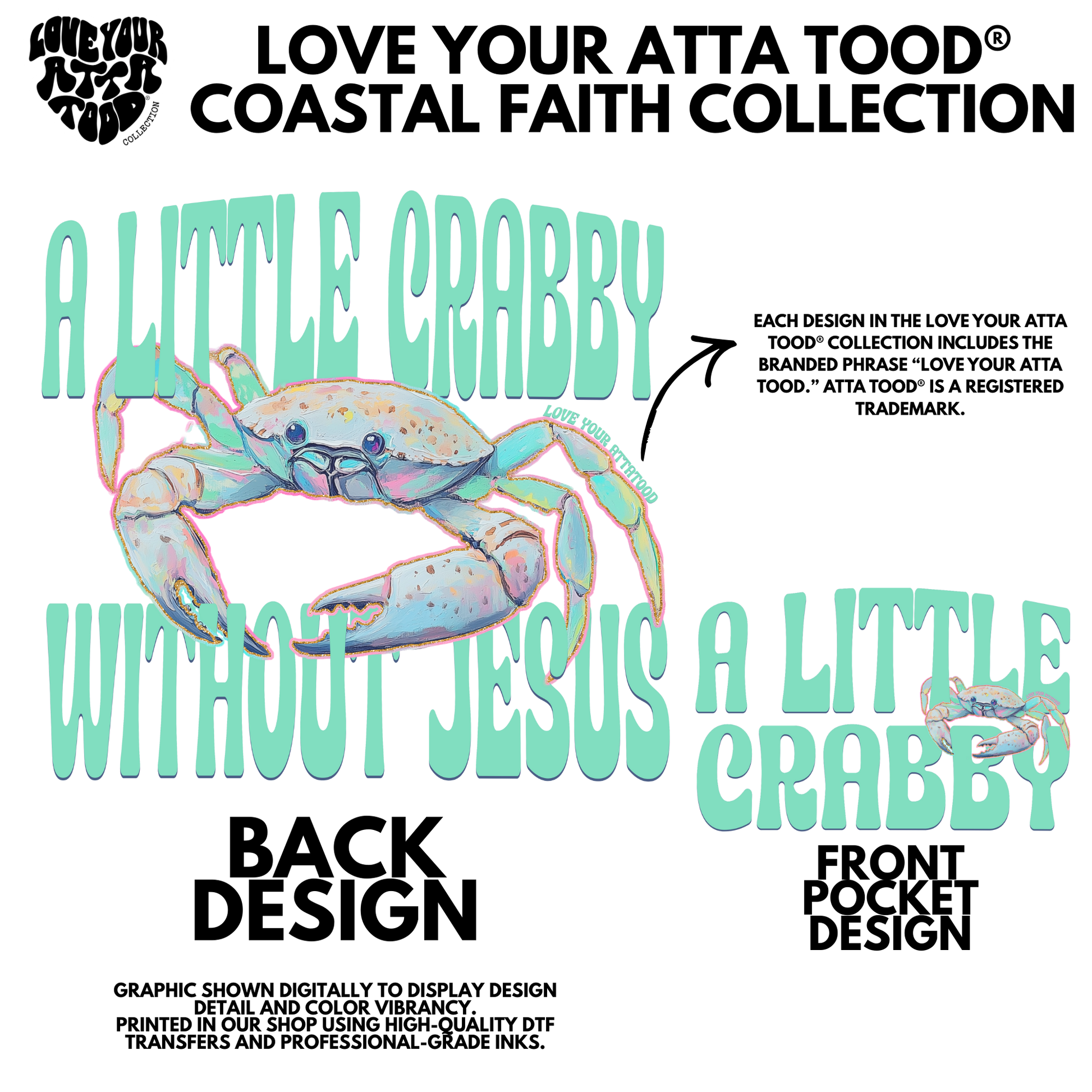 Each graphic includes our Love your ATTA TOOD® brand mark printed directly into the design for authentic brand recognition and consistent faith messaging.
